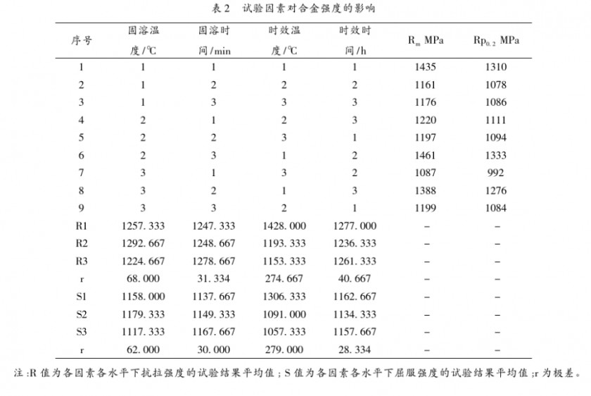 1)各因素对抗拉强度影响大小为:时效温度>固溶温度>时效时间>固溶时间;对屈服强度影响大小为:时效温度>固溶温度>固溶时间>时效时间;各因素对延伸率影响大小为:时效温度>固溶温度>时效时间>固溶时间。