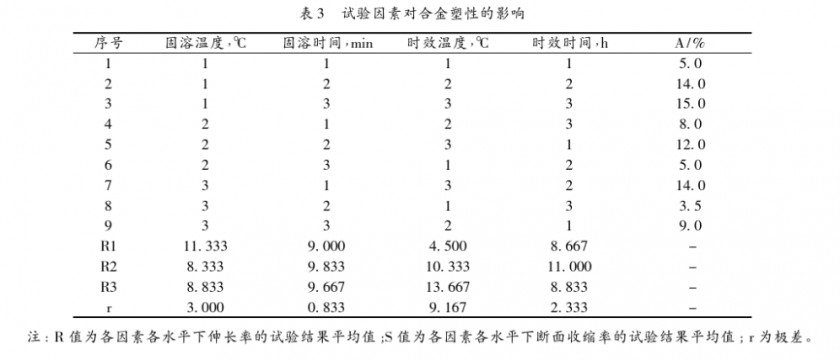 从表3可看出,各因素对延伸率影响大小为:时效温度>固溶温度>时效时间>固溶时间。其中,当时效温度为1水平550°C)时,合金板材的延伸率最小,为4.5% ,其余水平下延伸率相差不大。