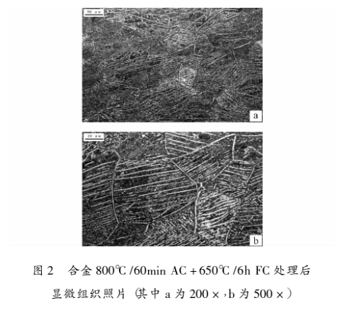综合各因素对合金强度、塑性及组织的影响,该合金板材获得高强度且延伸率较好的最佳热处理制度为:800°C /60min AC + 650°C /6h FC.
