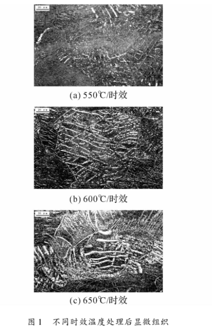 2.3各试验因素对合金组织的影响合金板材经800°C固溶后,经550°C、600°C、650°C时效后的显微组织见图1。随着时效温度的提高,α相析出数量逐渐增多,并聚集粗化,导致强度有所下降,但延伸率较高。