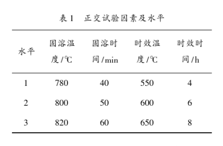1.2正交试验设计试验选用固溶温度、固溶时间、时效温度和时效时间四个因素,分别选用三个水平,采用正交设计表,研究不同因素对Ti55531钛合金板材强度和塑性的影响。各试验因素的水平见表1。