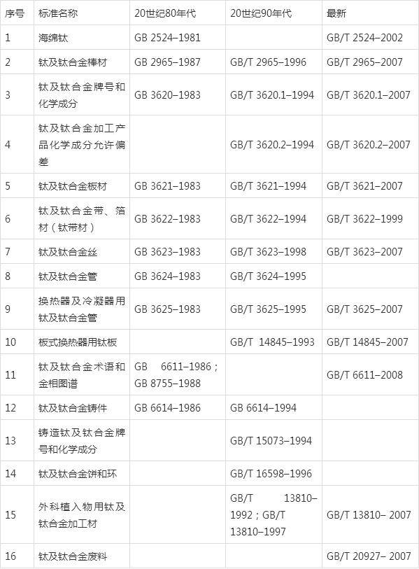 从20世纪90年代初期开始国家对标准进行修订,借鉴美国的经验,引入了钛合金材料用户的“复验分析允许偏差”理念,将GB 3620-1983分为两个标准,一个是GB/T 3620.1《钛及钛合金牌号和化学成分》,和GB/T 3620.2《钛及钛合金加工产品化学成分及成分允许偏差》。在GB/T 3620.1中纳入了新合金牌号TA0,TA7ELI,TA9,TA10,