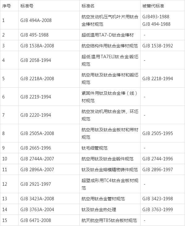 为了满足航空、航天等国防工业对钛合金材料更高要求的需求,1983年我国确立了国家军用标准体系,并于1987年8月28日通过审定并于1988年正式实施了我国第一个钛类国家军用标准GJB 391-1987《航天工业用TC4钛合金锻制饼材》。经过多年的发展和完善,到2000年已经初步形成了较完整的钛合金材料军用标准体系。此后到目前的一段时间内,并没有增加新的标准,只是更新了14项旧标准。目前现行GJB中与钛及钛合金相关的有34项,涉及航空工业的主要有25项,其中关于铆钉的有9项、螺栓1项,其余15项为重要钛材的标准(见表5)。